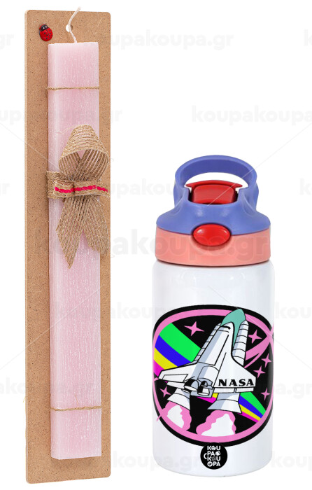 NASA pink, Easter Set, Children's thermal stainless steel water bottle with safety straw, pink/purple (350ml) & Easter scented flat candle (30cm) (PINK)