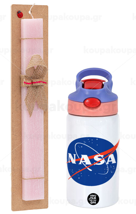 Nasa, Easter Set, Children's thermal stainless steel water bottle with safety straw, pink/purple (350ml) & Easter scented flat candle (30cm) (PINK)