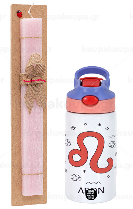 Ζώδια Λέων, Easter Set, Children's thermal stainless steel water bottle with safety straw, pink/purple (350ml) & Easter scented flat candle (30cm) (PINK)