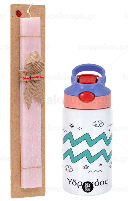 Ζώδια Υδροχόος, Easter Set, Children's thermal stainless steel water bottle with safety straw, pink/purple (350ml) & Easter scented flat candle (30cm) (PINK)