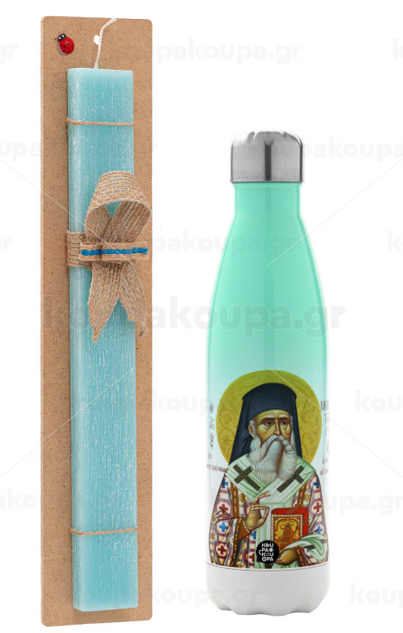 Saint Nektarios, Easter Set, Metallic green/white thermos (Stainless steel), double-walled, 500ml & scented flat Easter candle (30cm) (TURQUOISE)