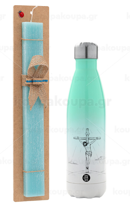 Jesus Christ , Easter Set, Metallic green/white thermos (Stainless steel), double-walled, 500ml & scented flat Easter candle (30cm) (TURQUOISE)