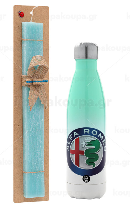 Alfa Romeo, Easter Set, Metallic green/white thermos (Stainless steel), double-walled, 500ml & scented flat Easter candle (30cm) (TURQUOISE)