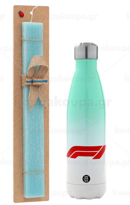 Formula 1, Easter Set, Metallic green/white thermos (Stainless steel), double-walled, 500ml & scented flat Easter candle (30cm) (TURQUOISE)