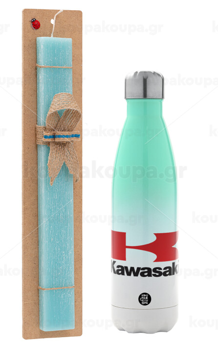 Kawasaki, Easter Set, Metallic green/white thermos (Stainless steel), double-walled, 500ml & scented flat Easter candle (30cm) (TURQUOISE)