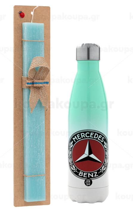 Mercedes vintage, Easter Set, Metallic green/white thermos (Stainless steel), double-walled, 500ml & scented flat Easter candle (30cm) (TURQUOISE)