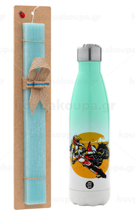 Motocross, Easter Set, Metallic green/white thermos (Stainless steel), double-walled, 500ml & scented flat Easter candle (30cm) (TURQUOISE)