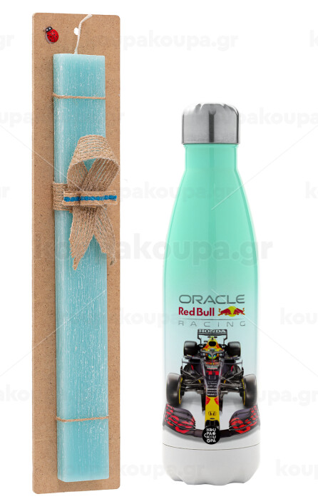 Redbull Racing Team F1, Easter Set, Metallic green/white thermos (Stainless steel), double-walled, 500ml & scented flat Easter candle (30cm) (TURQUOISE)