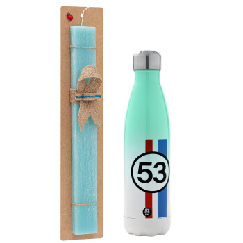 VW Herbie 53, Easter Set, Metallic green/white thermos (Stainless steel), double-walled, 500ml & scented flat Easter candle (30cm) (TURQUOISE)