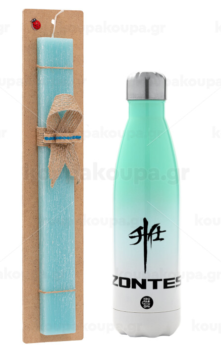 ZONTES, Easter Set, Metallic green/white thermos (Stainless steel), double-walled, 500ml & scented flat Easter candle (30cm) (TURQUOISE)