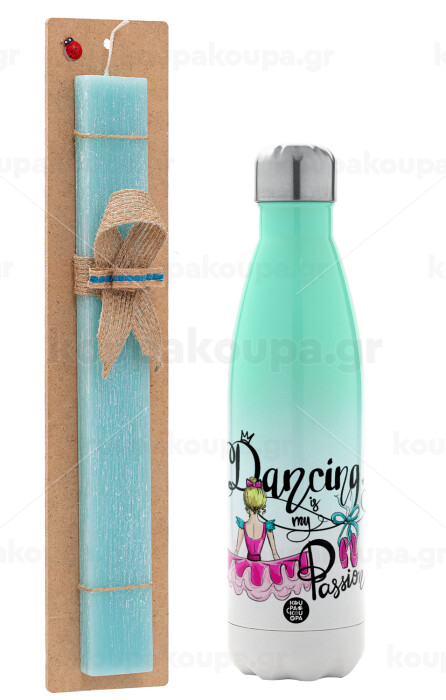Dancing is my Passion, Easter Set, Metallic green/white thermos (Stainless steel), double-walled, 500ml & scented flat Easter candle (30cm) (TURQUOISE)