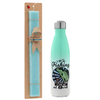 A bad day FISHING is better than a good day at work, Easter Set, Metallic green/white thermos (Stainless steel), double-walled, 500ml & scented flat Easter candle (30cm) (TURQUOISE)