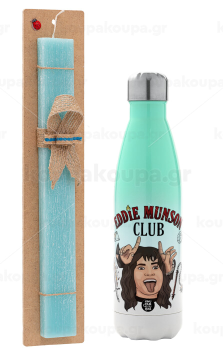Eddie Munson, Hellfire CLub, Stranger Things, Easter Set, Metallic green/white thermos (Stainless steel), double-walled, 500ml & scented flat Easter candle (30cm) (TURQUOISE)