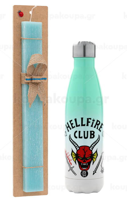 Hellfire CLub, Stranger Things, Easter Set, Metallic green/white thermos (Stainless steel), double-walled, 500ml & scented flat Easter candle (30cm) (TURQUOISE)