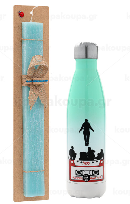 Running up that hill, Stranger Things, Easter Set, Metallic green/white thermos (Stainless steel), double-walled, 500ml & scented flat Easter candle (30cm) (TURQUOISE)