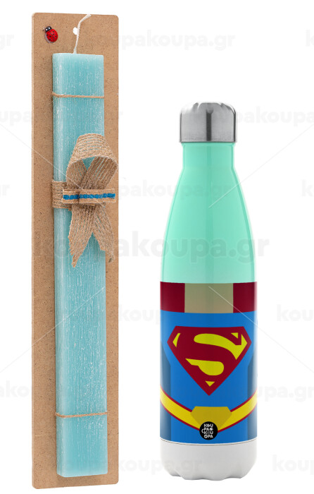 Superman flat, Easter Set, Metallic green/white thermos (Stainless steel), double-walled, 500ml & scented flat Easter candle (30cm) (TURQUOISE)