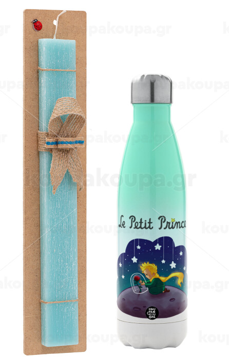 Little prince, Easter Set, Metallic green/white thermos (Stainless steel), double-walled, 500ml & scented flat Easter candle (30cm) (TURQUOISE)
