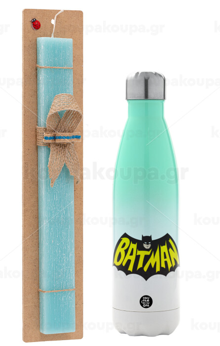 Batman classic logo, Easter Set, Metallic green/white thermos (Stainless steel), double-walled, 500ml & scented flat Easter candle (30cm) (TURQUOISE)