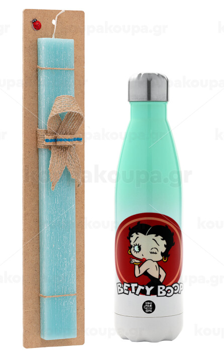 Betty Boop kiss, Easter Set, Metallic green/white thermos (Stainless steel), double-walled, 500ml & scented flat Easter candle (30cm) (TURQUOISE)