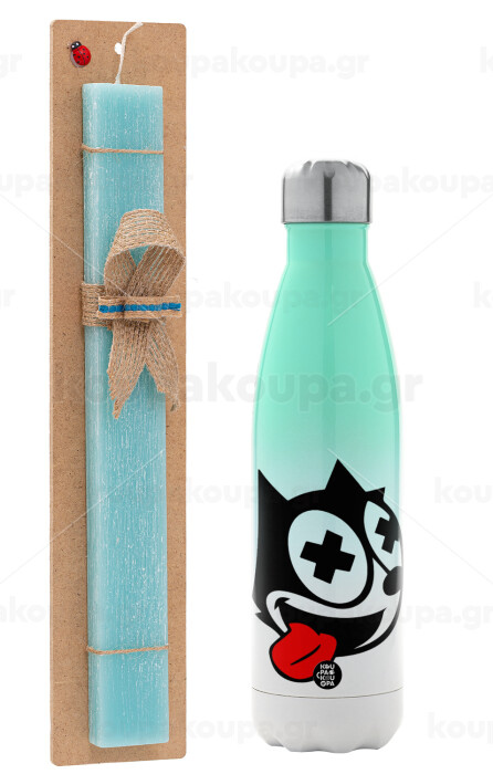 helix the cat, Easter Set, Metallic green/white thermos (Stainless steel), double-walled, 500ml & scented flat Easter candle (30cm) (TURQUOISE)