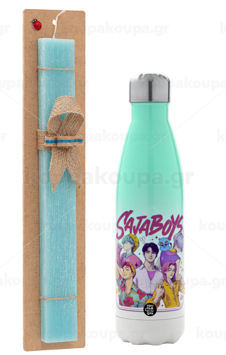Huntrix Saja Boys, Easter Set, Metallic green/white thermos (Stainless steel), double-walled, 500ml & scented flat Easter candle (30cm) (TURQUOISE)