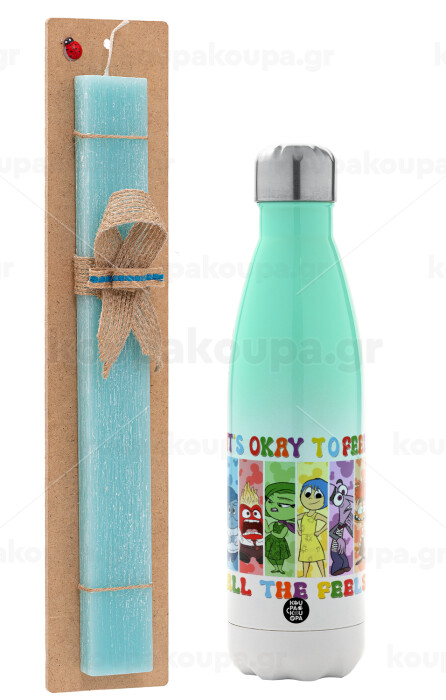 Inside Out It's Okay To Feel All The Feels , Easter Set, Metallic green/white thermos (Stainless steel), double-walled, 500ml & scented flat Easter candle (30cm) (TURQUOISE)