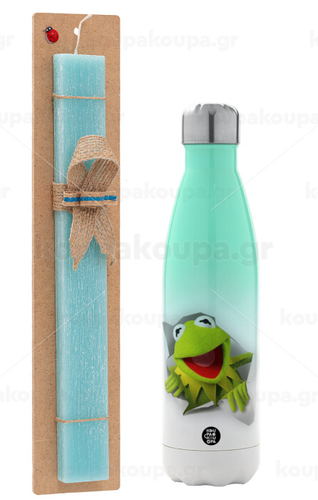 Kermit the frog, Easter Set, Metallic green/white thermos (Stainless steel), double-walled, 500ml & scented flat Easter candle (30cm) (TURQUOISE)