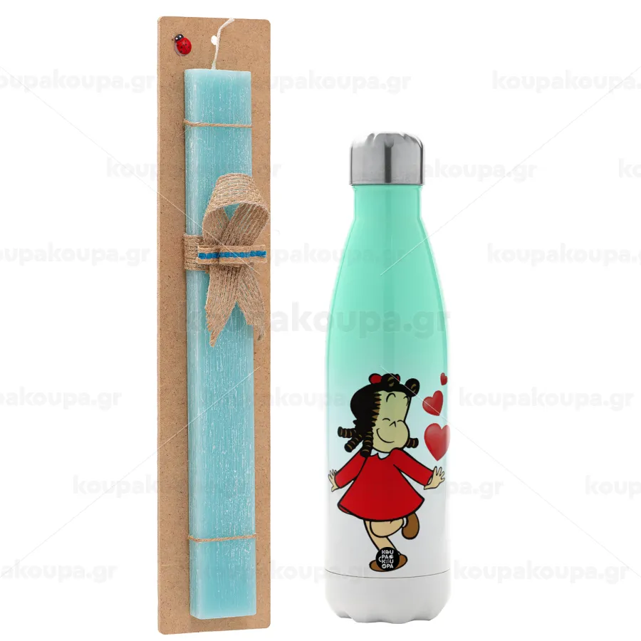 La petite Lulu, Easter Set, Metallic green/white thermos (Stainless steel), double-walled, 500ml & scented flat Easter candle (30cm) (TURQUOISE)