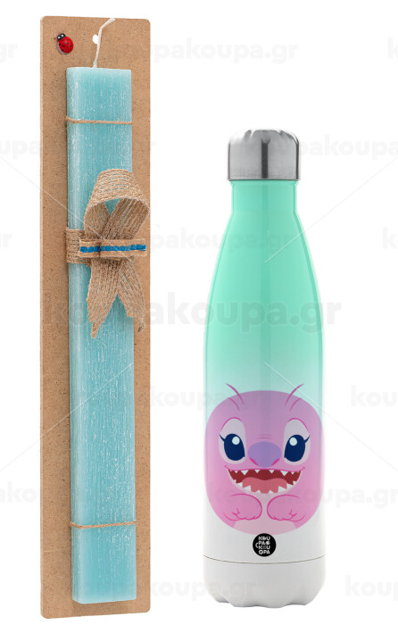 Lilo & Stitch Angel pink, Easter Set, Metallic green/white thermos (Stainless steel), double-walled, 500ml & scented flat Easter candle (30cm) (TURQUOISE)