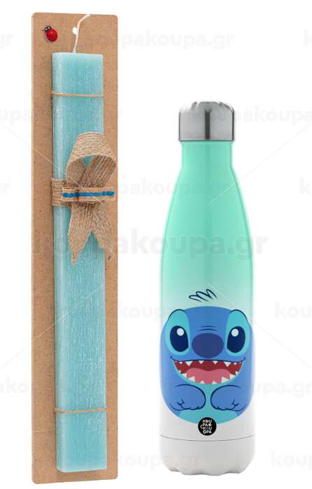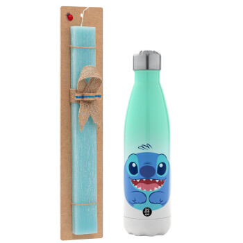 Lilo & Stitch blue, Easter Set, Metallic green/white thermos (Stainless steel), double-walled, 500ml & scented flat Easter candle (30cm) (TURQUOISE)
