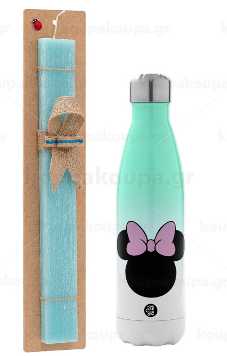 mouse girl, Easter Set, Metallic green/white thermos (Stainless steel), double-walled, 500ml & scented flat Easter candle (30cm) (TURQUOISE)