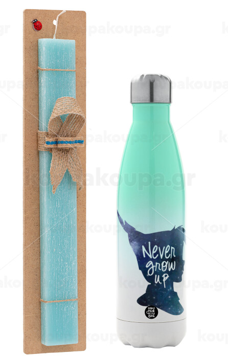 Never Grow UP, Easter Set, Metallic green/white thermos (Stainless steel), double-walled, 500ml & scented flat Easter candle (30cm) (TURQUOISE)