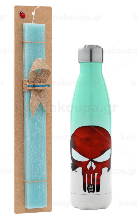 Red skull, Easter Set, Metallic green/white thermos (Stainless steel), double-walled, 500ml & scented flat Easter candle (30cm) (TURQUOISE)
