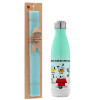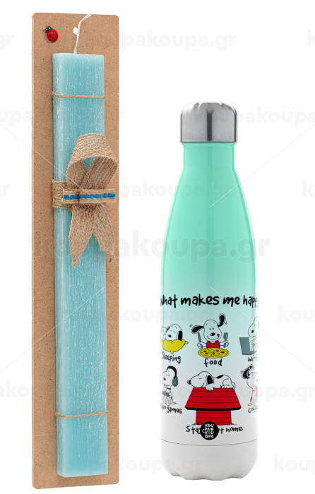 Snoopy what makes my happy, Easter Set, Metallic green/white thermos (Stainless steel), double-walled, 500ml & scented flat Easter candle (30cm) (TURQUOISE)