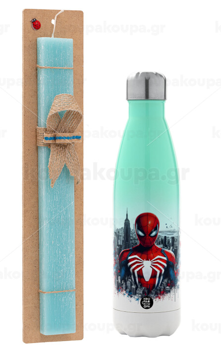 Spiderman City, Easter Set, Metallic green/white thermos (Stainless steel), double-walled, 500ml & scented flat Easter candle (30cm) (TURQUOISE)