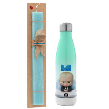 The boss baby, Easter Set, Metallic green/white thermos (Stainless steel), double-walled, 500ml & scented flat Easter candle (30cm) (TURQUOISE)