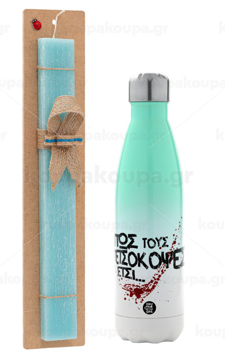 Πως τους πετσόκοψες έτσι..., Easter Set, Metallic green/white thermos (Stainless steel), double-walled, 500ml & scented flat Easter candle (30cm) (TURQUOISE)