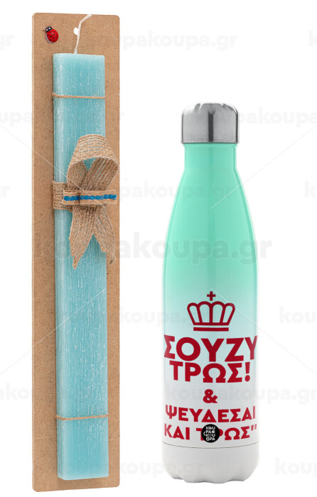 Σούζυ και ψεύδεσαι και τρως, Easter Set, Metallic green/white thermos (Stainless steel), double-walled, 500ml & scented flat Easter candle (30cm) (TURQUOISE)