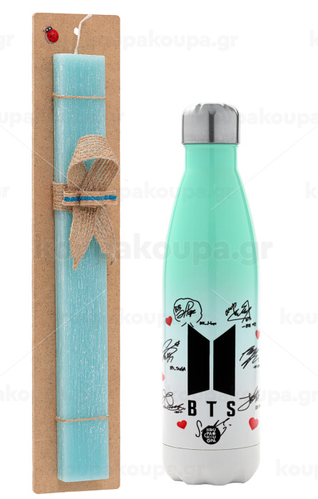 BTS signs, Easter Set, Metallic green/white thermos (Stainless steel), double-walled, 500ml & scented flat Easter candle (30cm) (TURQUOISE)