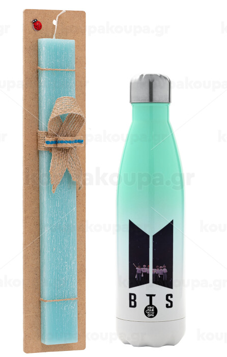 BTS, Easter Set, Metallic green/white thermos (Stainless steel), double-walled, 500ml & scented flat Easter candle (30cm) (TURQUOISE)