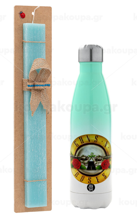 Guns N' Roses, Easter Set, Metallic green/white thermos (Stainless steel), double-walled, 500ml & scented flat Easter candle (30cm) (TURQUOISE)