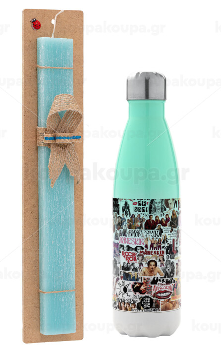 Maneskin stickers, Easter Set, Metallic green/white thermos (Stainless steel), double-walled, 500ml & scented flat Easter candle (30cm) (TURQUOISE)