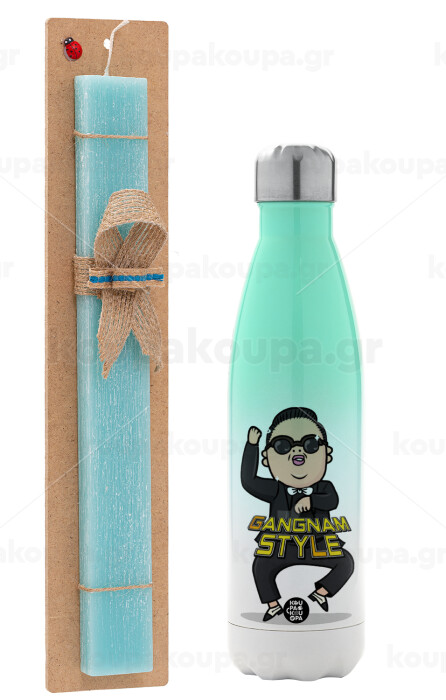 PSY - GANGNAM STYLE, Easter Set, Metallic green/white thermos (Stainless steel), double-walled, 500ml & scented flat Easter candle (30cm) (TURQUOISE)