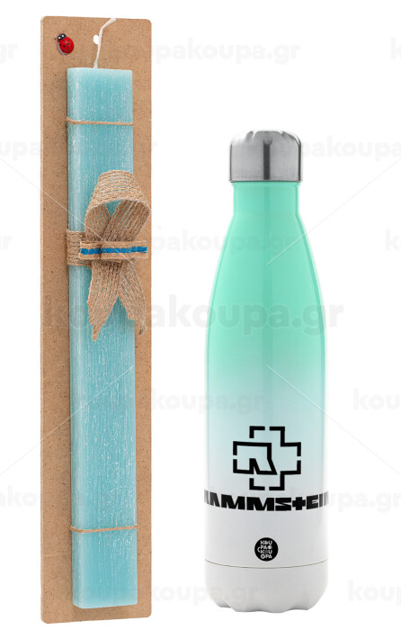 Rammstein, Easter Set, Metallic green/white thermos (Stainless steel), double-walled, 500ml & scented flat Easter candle (30cm) (TURQUOISE)
