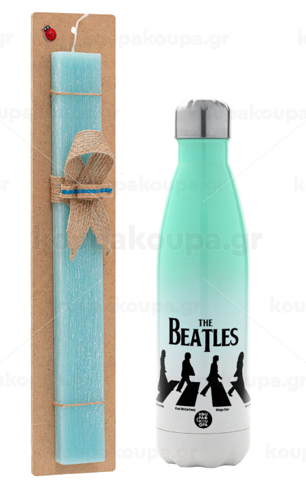 The Beatles, Abbey Road, Easter Set, Metallic green/white thermos (Stainless steel), double-walled, 500ml & scented flat Easter candle (30cm) (TURQUOISE)