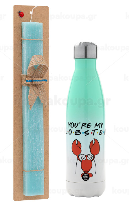 Friends you're my lobster, Easter Set, Metallic green/white thermos (Stainless steel), double-walled, 500ml & scented flat Easter candle (30cm) (TURQUOISE)