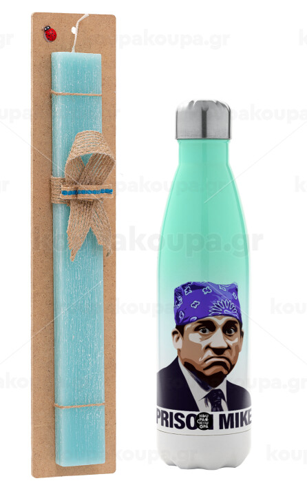 Prison Mike The office, Easter Set, Metallic green/white thermos (Stainless steel), double-walled, 500ml & scented flat Easter candle (30cm) (TURQUOISE)