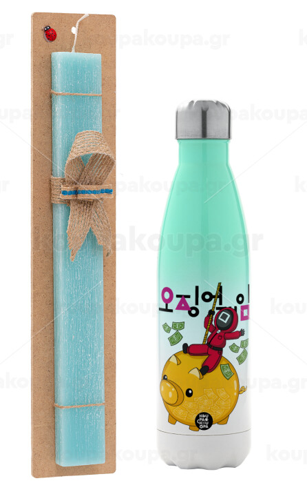 Squid game money pig, Easter Set, Metallic green/white thermos (Stainless steel), double-walled, 500ml & scented flat Easter candle (30cm) (TURQUOISE)