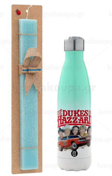 The Dukes of Hazzard, Easter Set, Metallic green/white thermos (Stainless steel), double-walled, 500ml & scented flat Easter candle (30cm) (TURQUOISE)