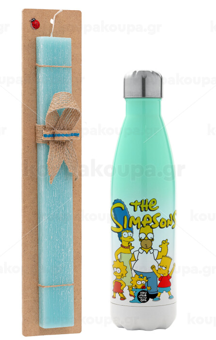 The Simpsons, Easter Set, Metallic green/white thermos (Stainless steel), double-walled, 500ml & scented flat Easter candle (30cm) (TURQUOISE)